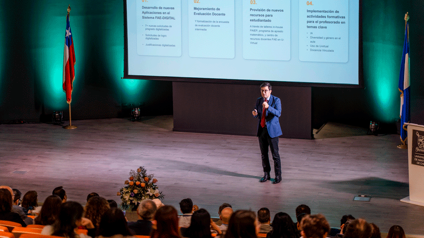Durante su intervención, el decano enfatizó el sentido colectivo de estos logros: “La Facultad de Administración y Economía transforma con valor. Lo que hemos alcanzado este año no es el resultado de una sola persona, sino del trabajo mancomunado de nuestras y nuestros funcionarios, académicas, académicos y estudiantes. Avanzamos con convicción hacia una docencia de excelencia, una investigación más influyente y una internacionalización estratégica que proyecta a nuestra facultad en Chile y el mundo”, subrayó.